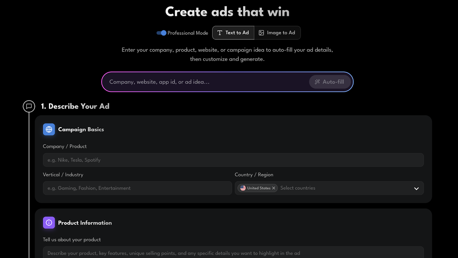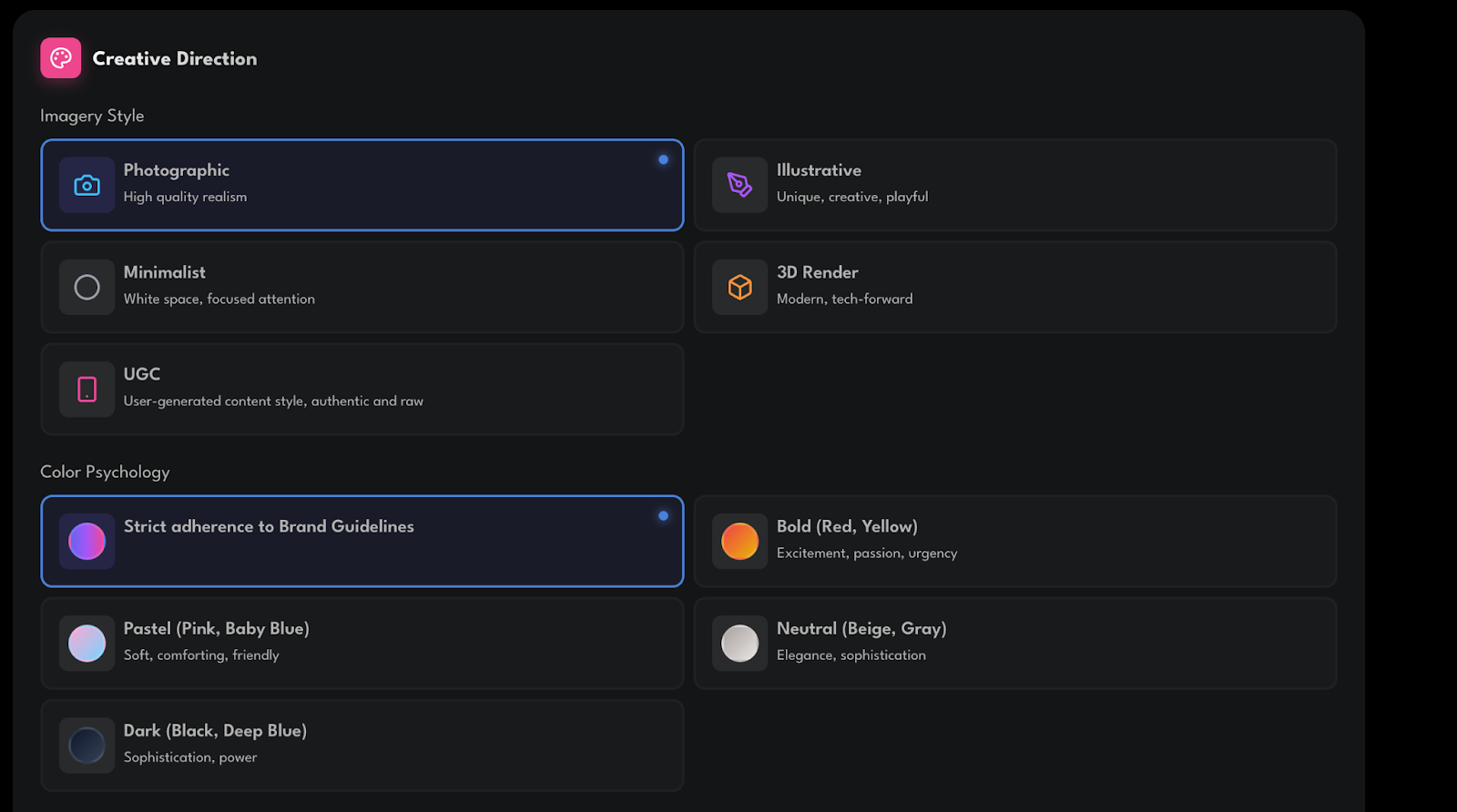 Choose how you want the ads to look and feel. Pick your imagery style, colors, typography, mood, and layout. Then click generate.