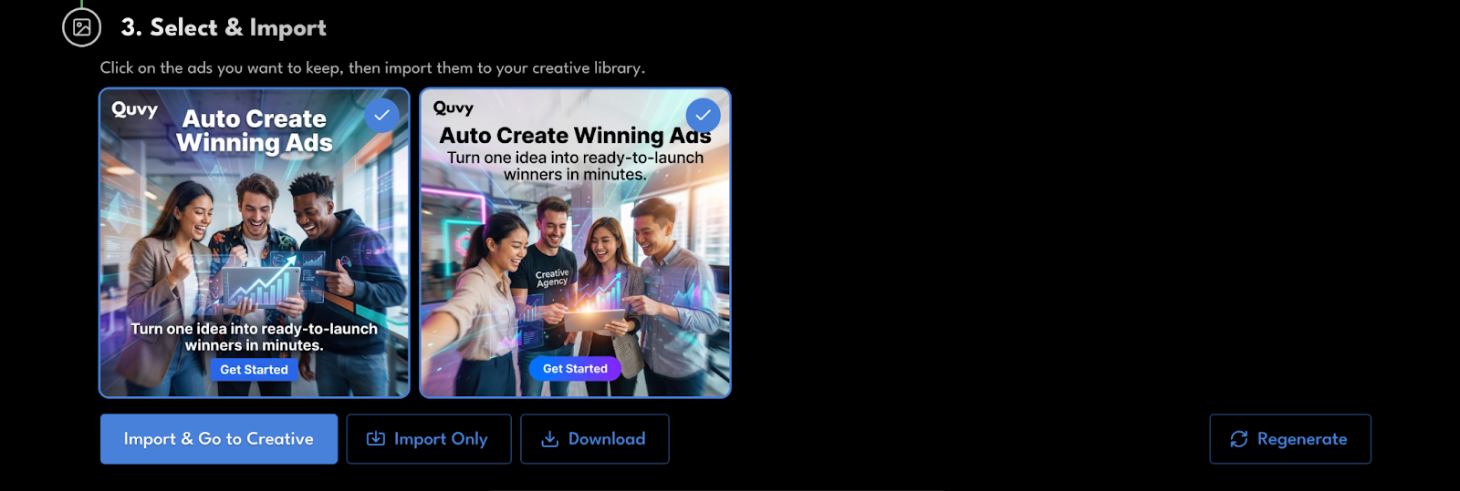Import winners and go to Creative to start testing, choose import only to keep generating, download your new creatives, or hit regenerate for a different direction.